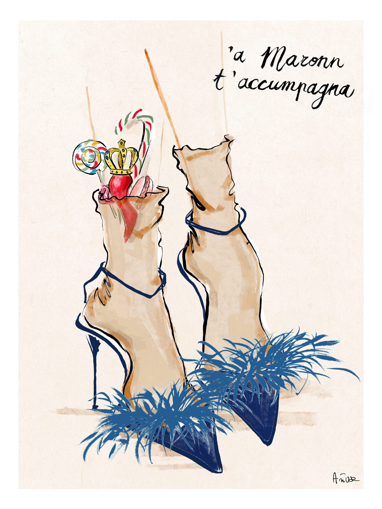 Quest’opera è dedicata al mio amore per la città di Napoli: è innegabile che abbia un fascino unico. Ho voluto rappresentare come la credenza del malocchio, tra superstizione e folklore, sia così rappresentativa del territorio partenopeo e radicata nella cultura attraverso un simbolo iconico, il corno portafortuna, che fa capolino dalle calze, insieme alla famosa espressione “‘a Maronn t’accompagna” per seguirci e assisterci in ogni passo.